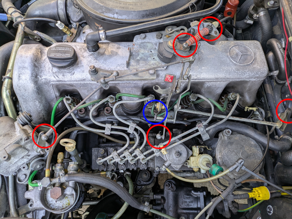 The linkages you need to pop off are circled in red, and the return line is circled in blue right in the center of the following image: